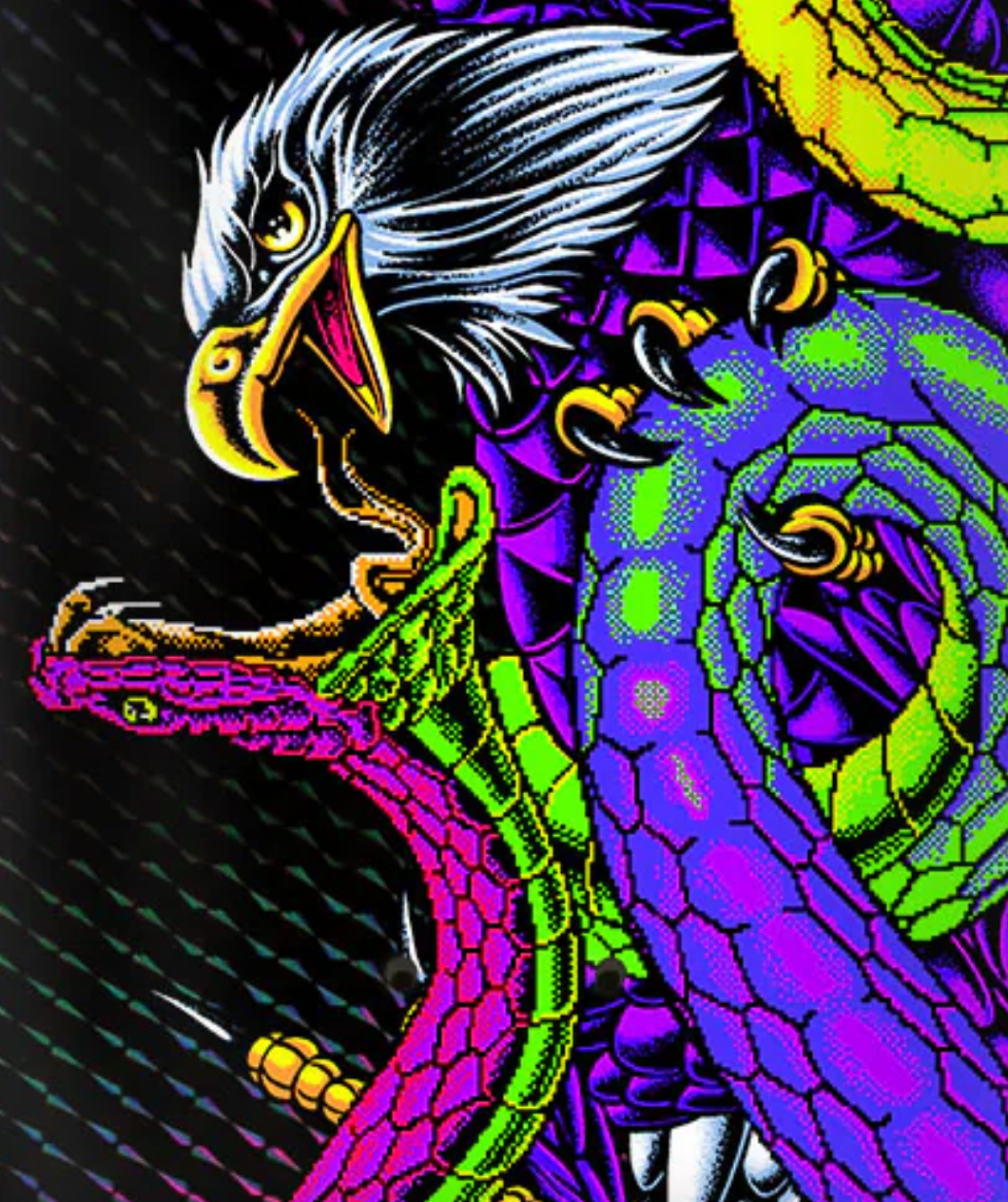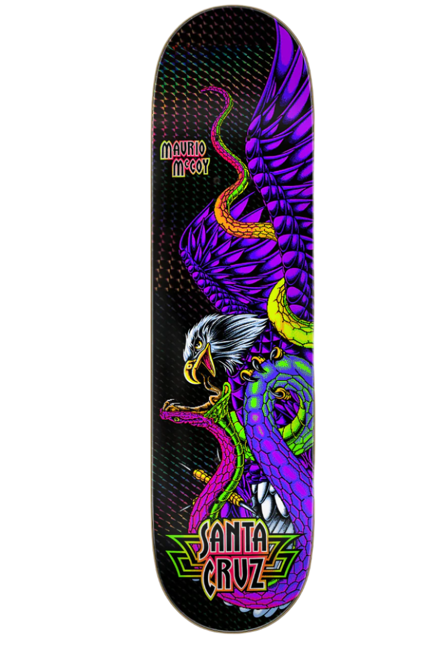 Santa Cruz Skateboards Maurio McCoy Battle Pro VX Deck featuring black square prismatic foil with neon graphics on Maurio's custom shaped 8.25" twin and art by Sam Pierson